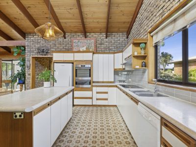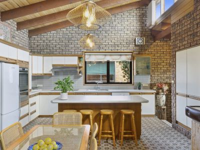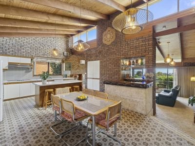 Inside, the home opens into a warm and inviting sunken living room. The room is complete with an efficient and sealed, wood fireplace, as well as a split system air conditioner creating a cozy and charming atmosphere throughout every season. The living area flows effortlessly into the connected kitchen and dining space, offering a functional layout ideal for both everyday living and entertaining. The home displays warmth via the tall timber ceilings with exposed timber beams and brick feature walls throughout. All rooms reveal big windows allowing loads of natural light in to brighten the day and capture the garden from every angle.