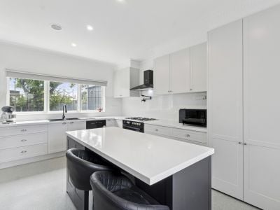 At the heart of the home is the generous open kitchen and dining area. The spacious and well thought out kitchen is sure to impress with abundant storage, a large island bench, and plenty of room for family living and entertaining. The adjoining dining room is equally spacious and features large doors that open directly to the backyard, seamlessly blending indoor and outdoor living.