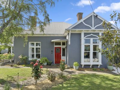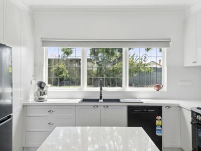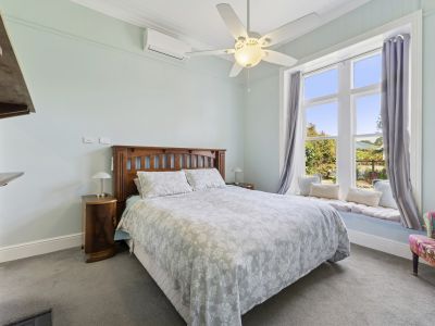 The home boasts three/four well-sized bedrooms. The master suite is a true retreat, complete with a walk-in wardrobe, private ensuite, and its own ornamental fireplace. Two additional bedrooms also feature excellent proportions, with one offering an ornamental fireplace, while another includes a raised platform originally designed as a theatre room-perfect to reimagine as a media space, playroom, study, or creative retreat. Serviced by a spacious central bathroom with all the essentials including the stunning leadlight window.