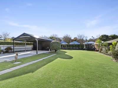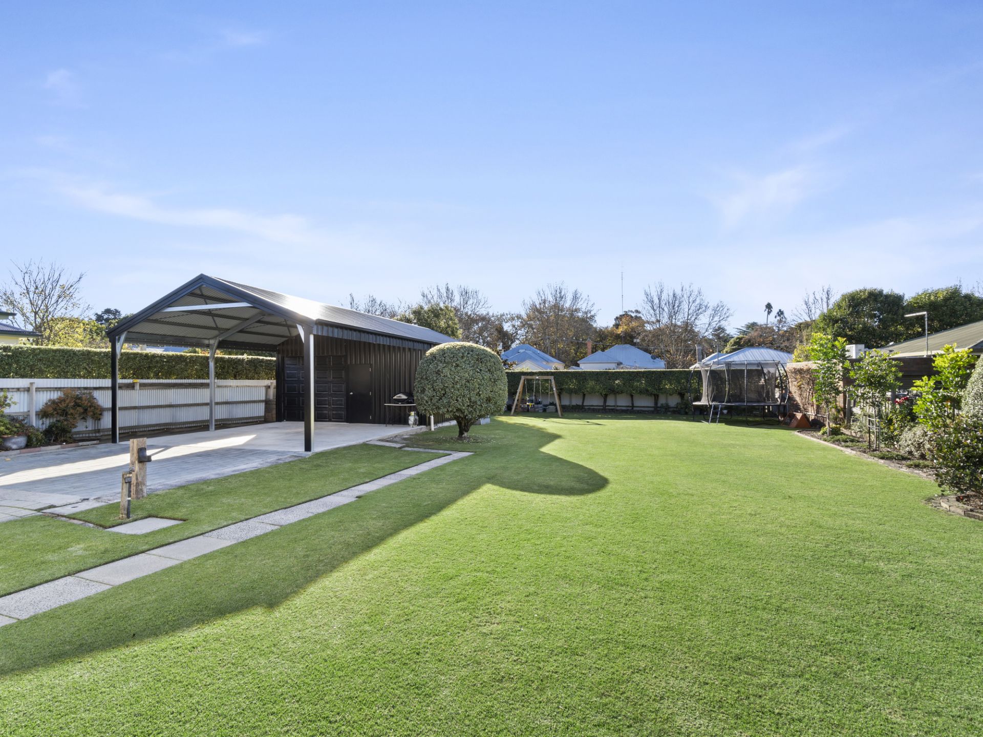 The long-paved driveway leads to a large shed consisting of the double carport at the front and 7m x 6m enclosed shed to the back with a wood heater and glass sliding door. Additionally, to the rear of the shed is a smaller 3m x 2m garden shed, clothesline and dog enclosure. The north facing backyard offers an expansive lawn area and with aspects of the Botanical Gardens tree line, it makes for a delightful view.
