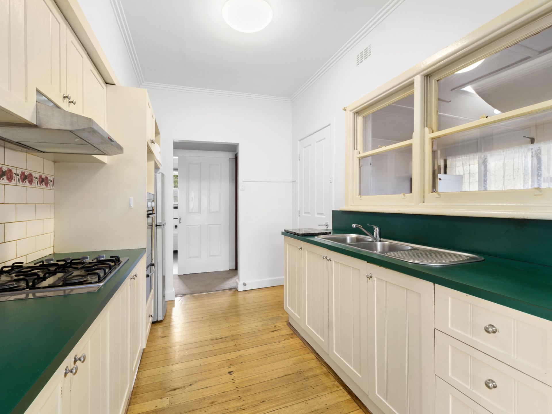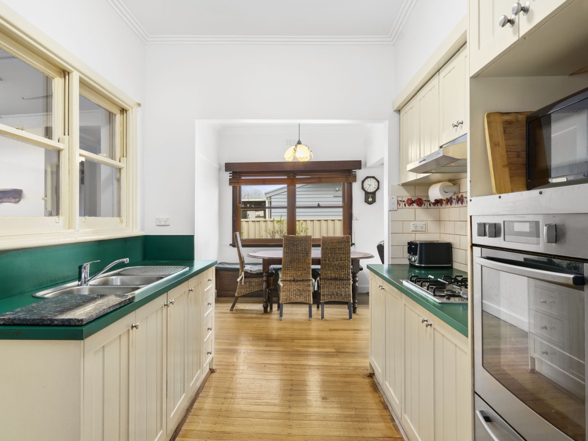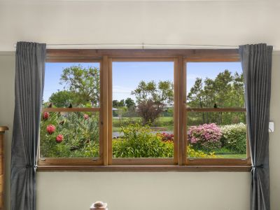 At the heart of the home is an open-plan living, dining, and kitchen area. The living space is generously sized, with large windows that flood the room with natural northerly light. Warm timber accents throughout add a touch of charm and warmth. The galley kitchen connects to the back enclosed porch.