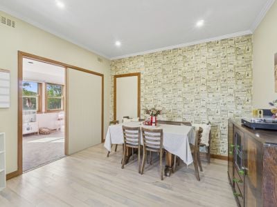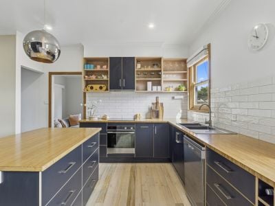 Step inside and be welcomed by the warmth of timber floors throughout, and a cozy wood fireplace in the living room – perfect for those cooler nights. The heart of the home is the open kitchen and dining area, where you'll find ample bench space and plenty of room for family meals and entertaining. The striking blue cabinetry with timber benchtops and wallpaper adorning the dining room wall are both unique and charming.